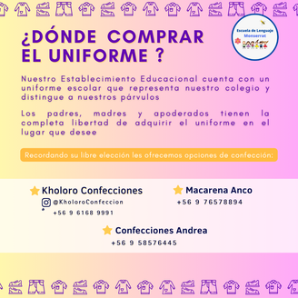 Los apoderados tienen la completa libertad de adquirir el uniforme en el lugar que desee. La no adquisición del uniforme escolar no es impedimento para que el alumno ingrese a nuestra escuela ni para que pueda realizar las diversas actividades escolares, sin discriminación alguna.