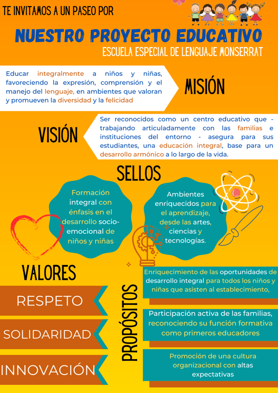 La Escuela de Lenguaje Monserrat sustenta su gestión para el periodo 2021-2023, en el desarrollo de los siguientes valores: respeto, solidaridad e innovación.